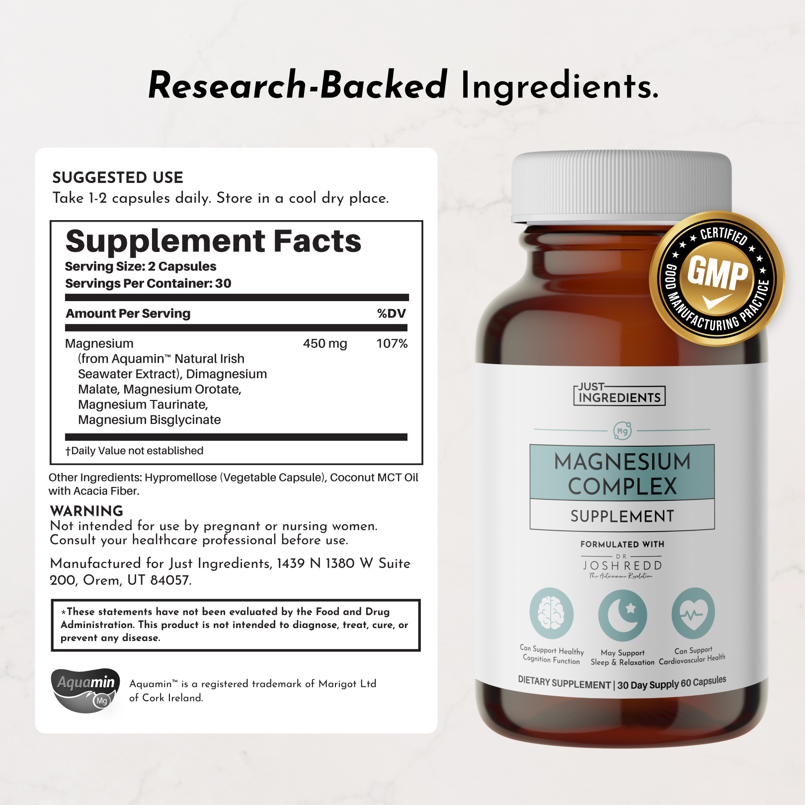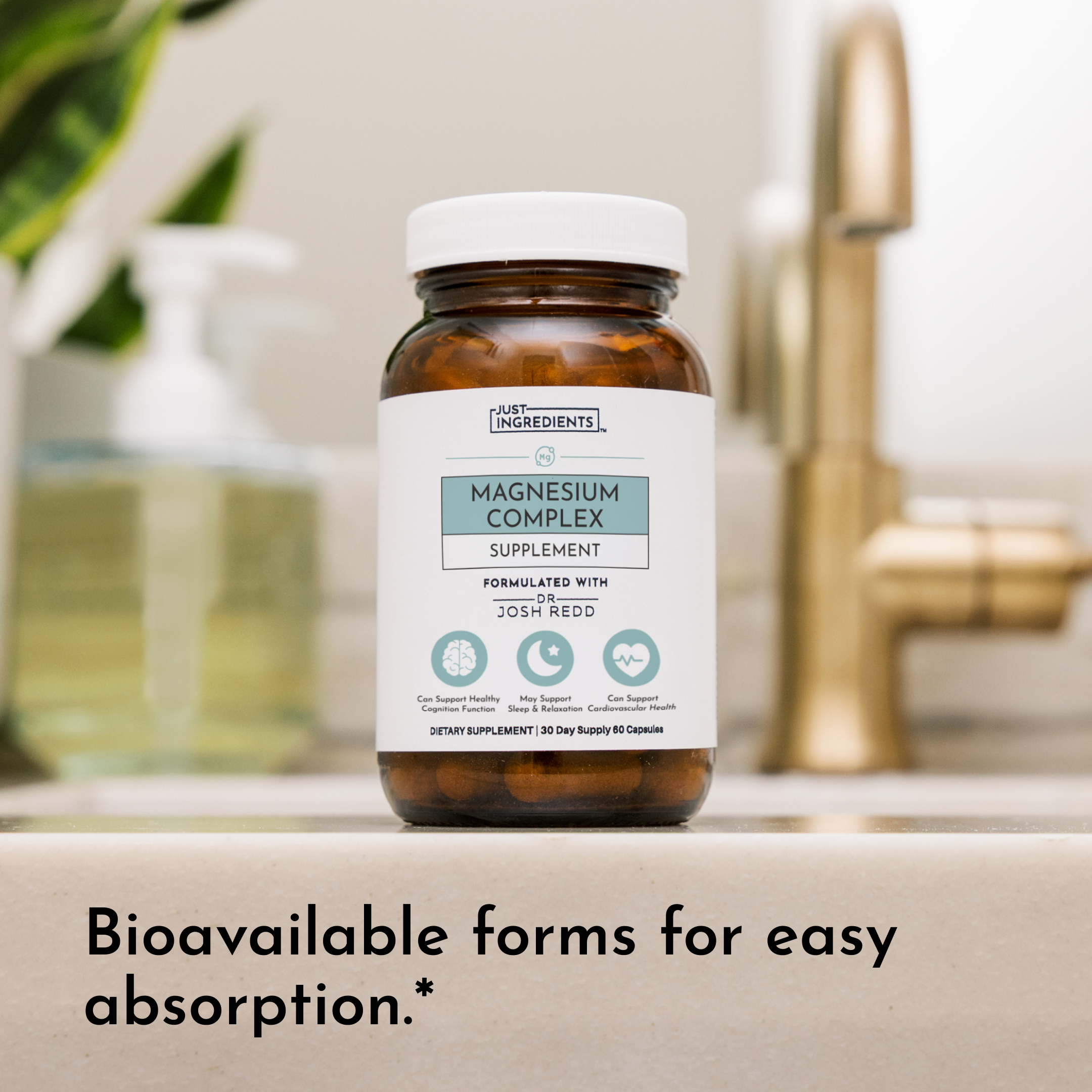 Just Ingredients Magnesium Complex supports hundreds of essential bodily functions. including sleep. relaxation. mood. heart health. and nervous system regulation.* It combines five bioavailable forms of magnesium. each chosen for their unique roles and benefits to promote improved absorption and effectiveness. Free from magnesium oxide—which can cause digestive discomfort—this formula is gentle on digestion and includes a broad spectrum of trace minerals sourced from the mineral-rich Irish seas through Aquamin®.*