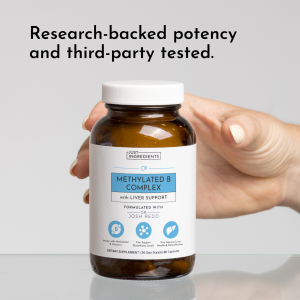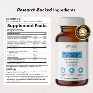 Just Ingredients Methylated B Complex supports healthy liver function and detoxification pathways.* By promoting healthy methylation and detoxification. this formula may help support essential functions related to nutrient metabolism and cellular health.* It features methylated B vitamins—folate and B12—in forms the body can use immediately. along with supportive nutrients like zinc. L-methionine. and betaine to assist natural liver detox processes. Plus. it includes organic milk thistle and dandelion root—herbs traditionally used to support liver health and bile flow.*