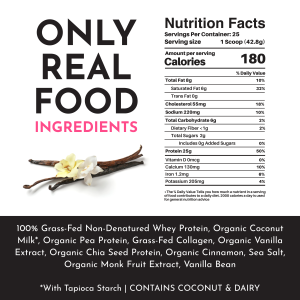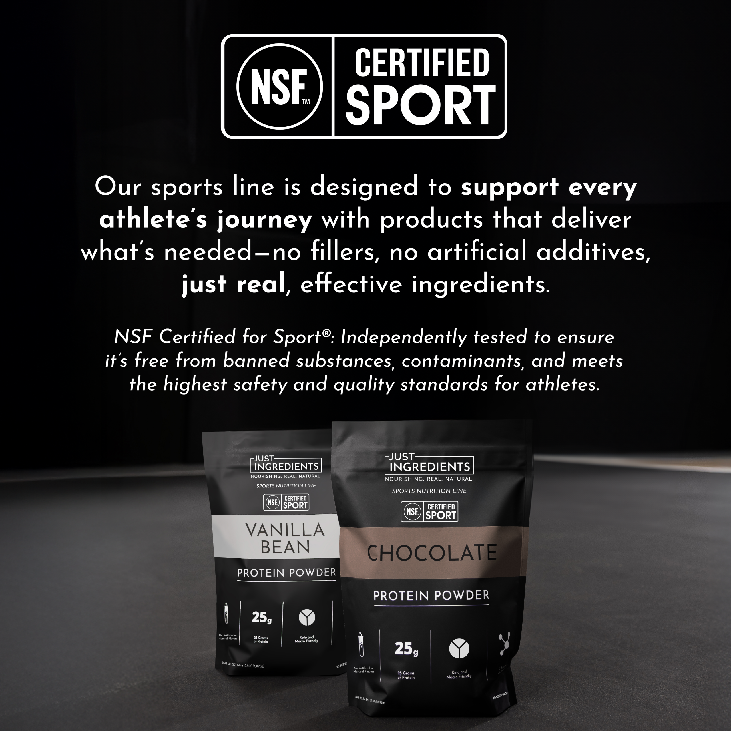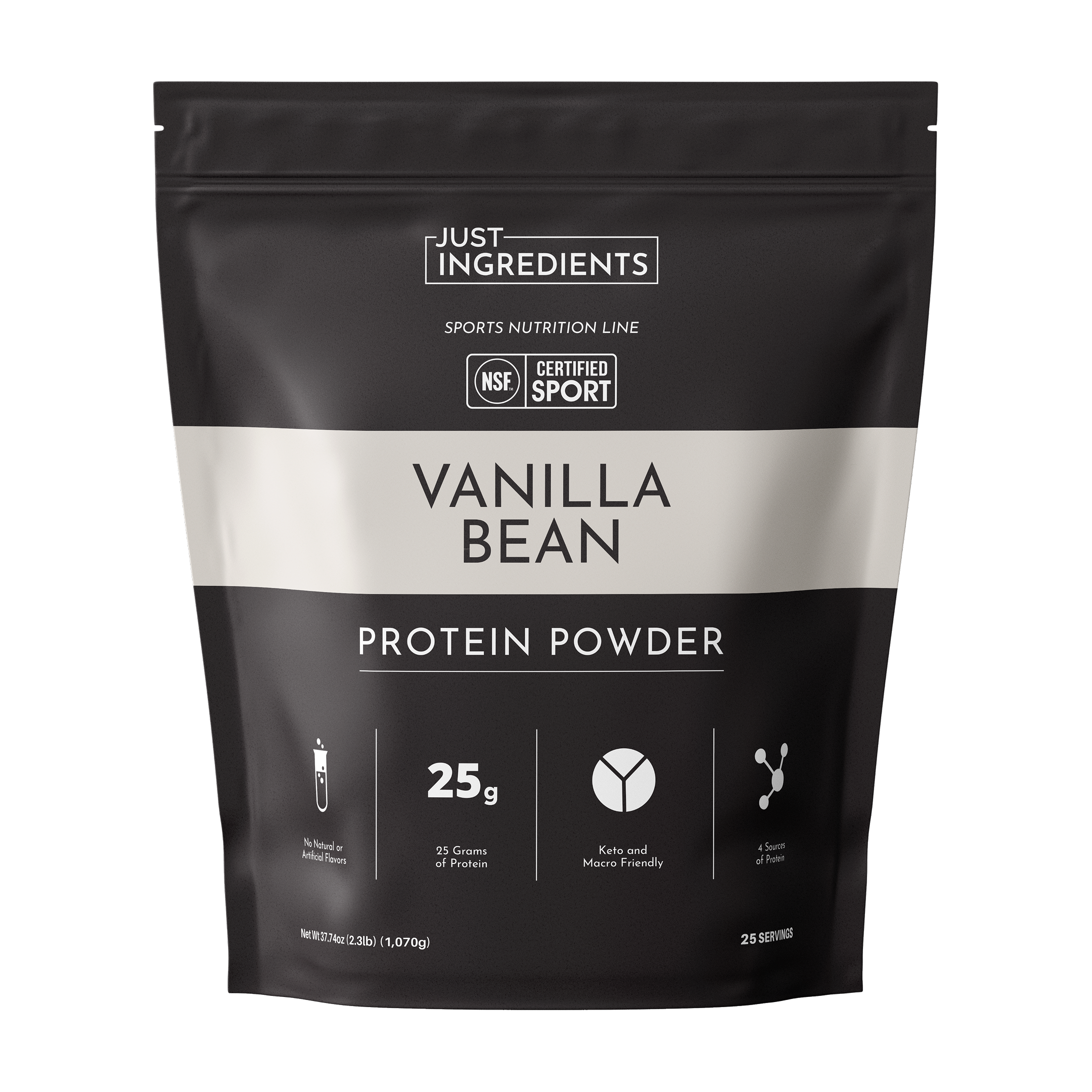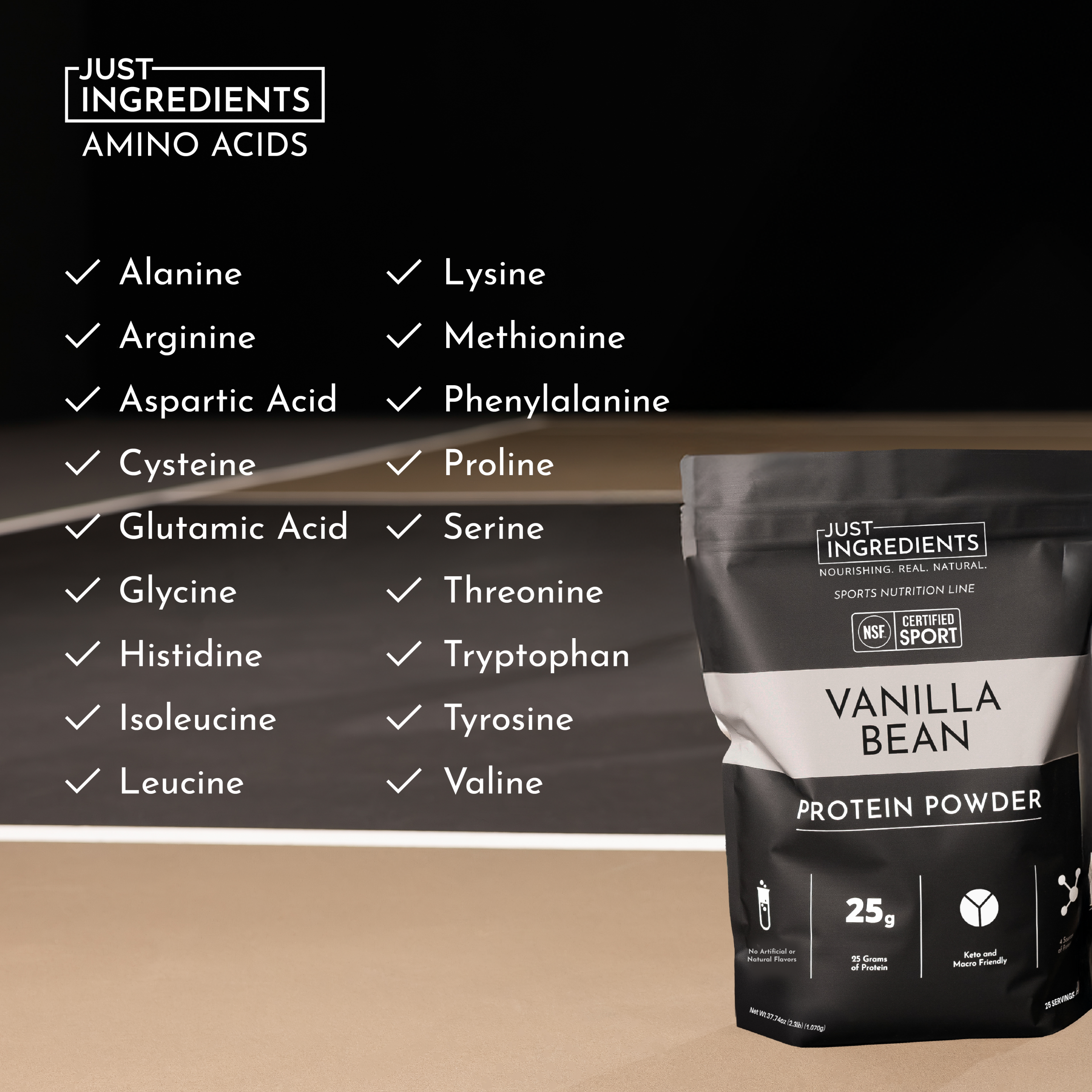 Vanilla Bean Protein Powder is made with four premium protein sources and no artificial sweeteners or sugar alcohols. Proudly NSF Certified for Sport. this formula meets rigorous safety and quality standards. Made with 100% grass-fed. non-denatured whey from New Zealand. organic pea protein. grass-fed collagen. and organic chia seed protein.